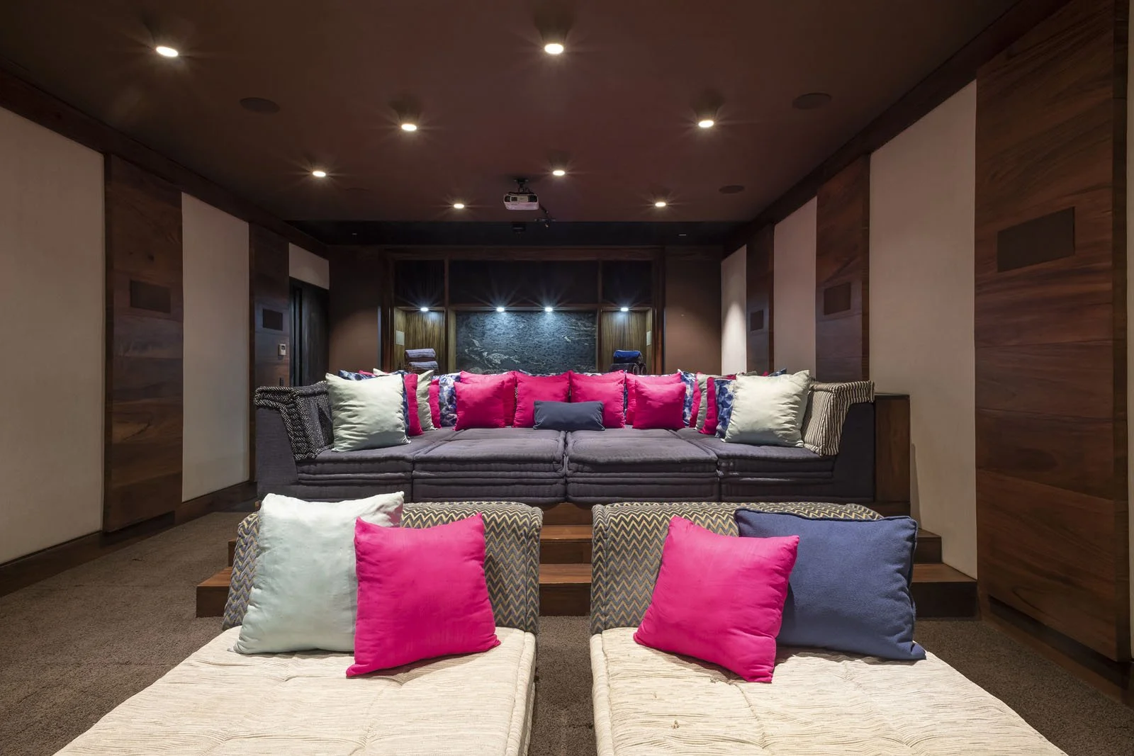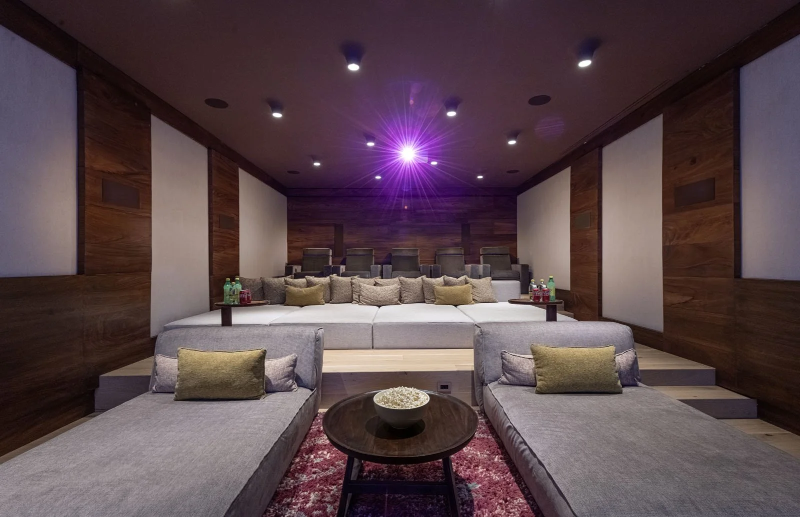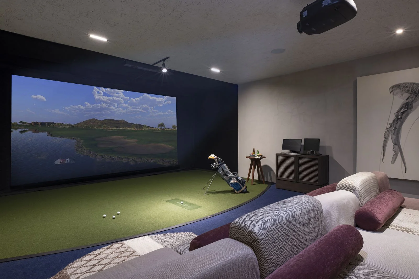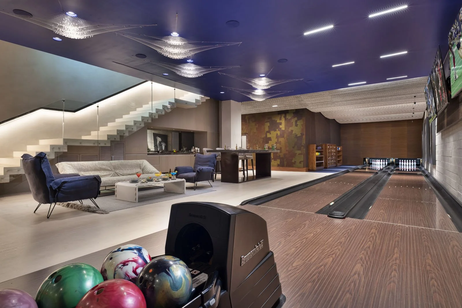 Casa Del Oso is home to a championship Brunswick Gold Crown V billiards table, a customized wood ping-pong table, six-player card table, two-lane bowling alley, golf simulator, and movie theater with a 110-inch screen.