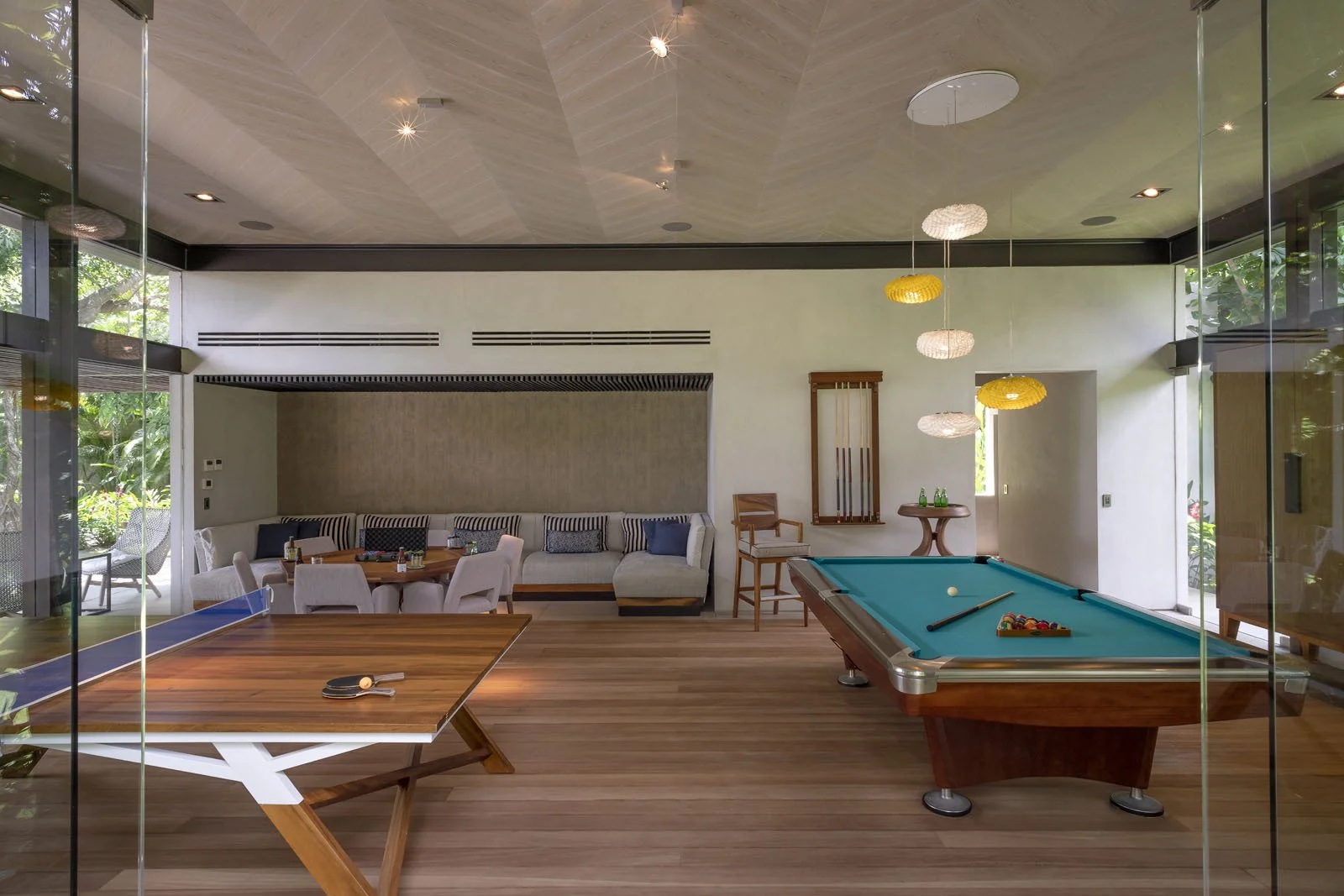 Just outside the gaming room is a custom poured volleyball pool, where families and friends can choose sides and challenge each other to spirited games.